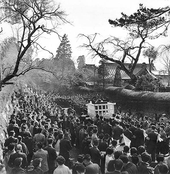 Già prima dell’alba i giovani iniziarono ad affluire con i treni notturni e i pullman a noleggio. L’aria del mattino era fredda e il fiato si condensava in nuvolette bianche. La zuppa di maiale che Toda aveva fatto servire loro li riscaldò fino al midollo, e prima ancora che la cerimonia avesse inizio i cuori dei giovani erano già in fiamme.