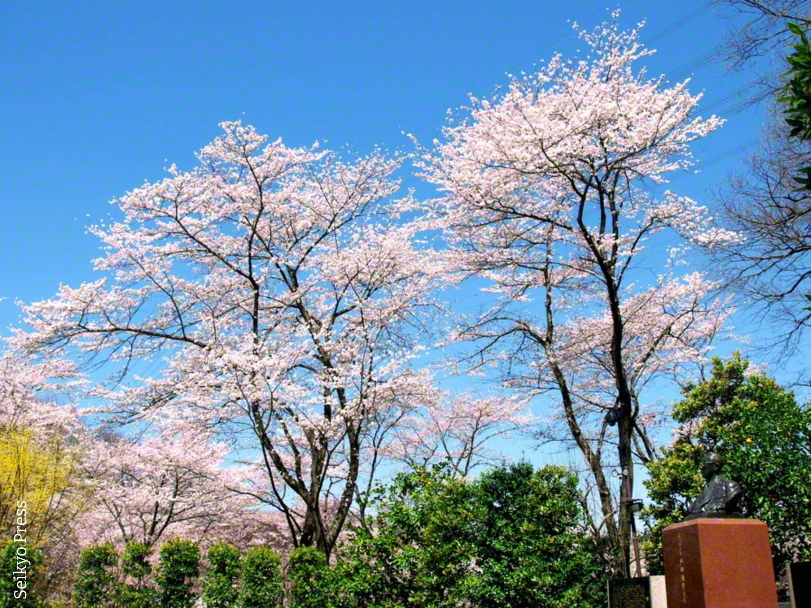 Dopo aver superato una stagione estremamente fredda, i fiori di ciliegio sono sbocciati con tutta la loro energia sotto il limpido cielo primaverile. Un busto del secondo presidente della Soka Gakkai, Josei Toda, sembra vegliare su di loro.