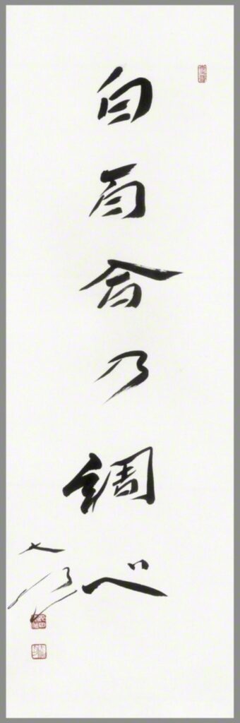 Vorrei offrire questa calligrafia, “Melodia dei gigli bianchi”, come dono commemorativo da parte mia e di mia moglie Kaneko, affinché possa essere esposta al Centro internazionale delle donne [vicino alla sede centrale della Soka Gakkai a Shinanomachi, Tokyo, ndr.].