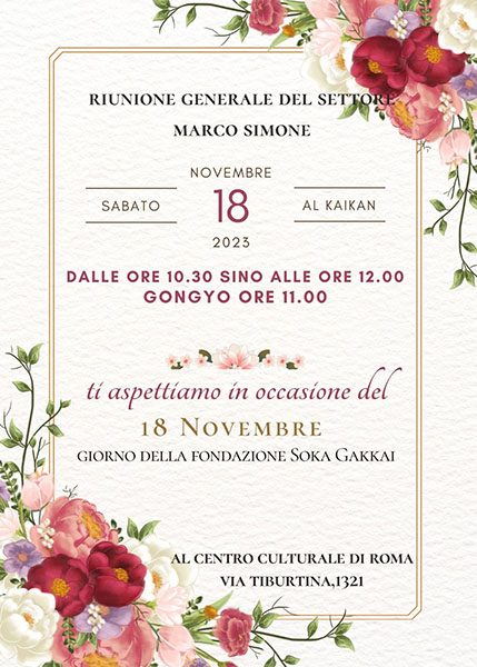 Per commemorare il giorno della fondazione della Soka Gakkai e il decimo anniversario dall’apertura del Kosen-rufu Daiseido, come responsabili di settore avevamo deciso di organizzare un incontro al Centro culturale per riunire tutti i compagni di fede e invitare le persone a cui stiamo parlando della pratica buddista, con il desiderio di mostrare la nostra gratitudine a Sensei e rilanciare l’obiettivo di far emergere un giovane in ogni gruppo. Quando abbiamo saputo dell’indicazione nazionale di realizzare delle gioiose attività a livello di settore per il 18 novembre siamo stati subito felicissimi di abbracciare questa proposta insieme a tutti i membri in Italia!