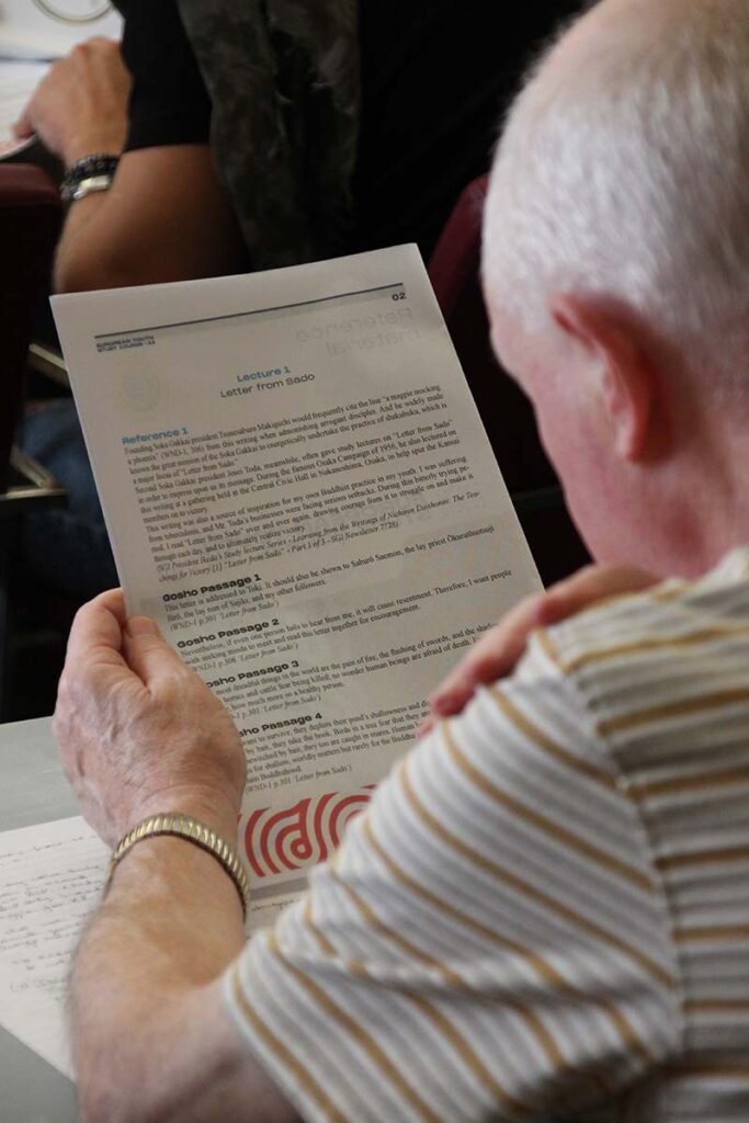 Durante il corso, il vice responsabile del Dipartimento di Studio della SGI Hideyuki Takano, ha tenuto una lezione sul Gosho Lettera da Sado, una lezione incentrata sulla vita di Nanjo Tokimitsu come esempio di giovane discepolo e una sessione di domande e risposte.