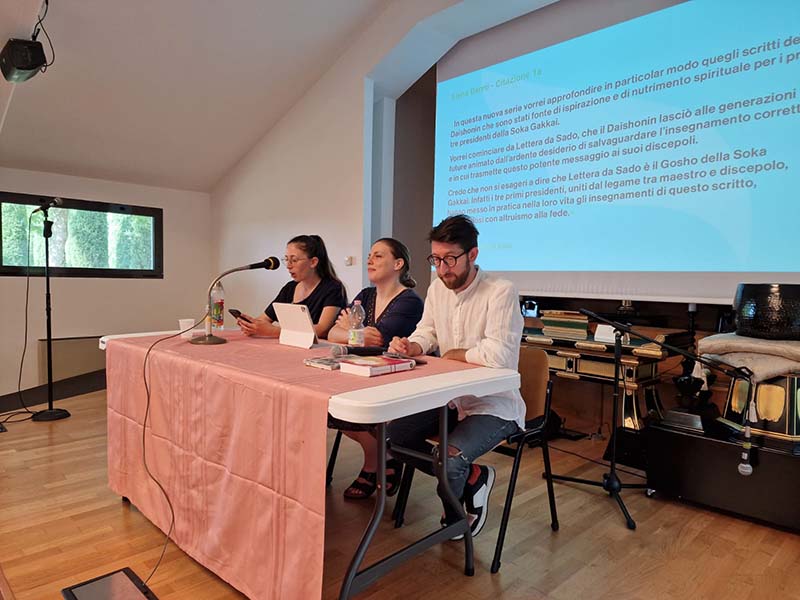 Alle 09:35 comincia lo studio del Gosho Lettera da Sado, a cura di Alessja Trama, Elena Benni e Lorenzo Console, responsabili nazionali del Gruppo futuro, che riportano diversi brani del Gosho e della lezione del maestro Ikeda e trasmettono tramite la loro esperienza e le loro determinazioni l’importanza del voto condiviso di maestro e discepolo, il cuore del Buddismo.