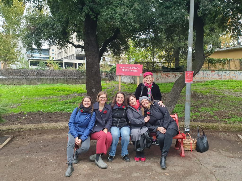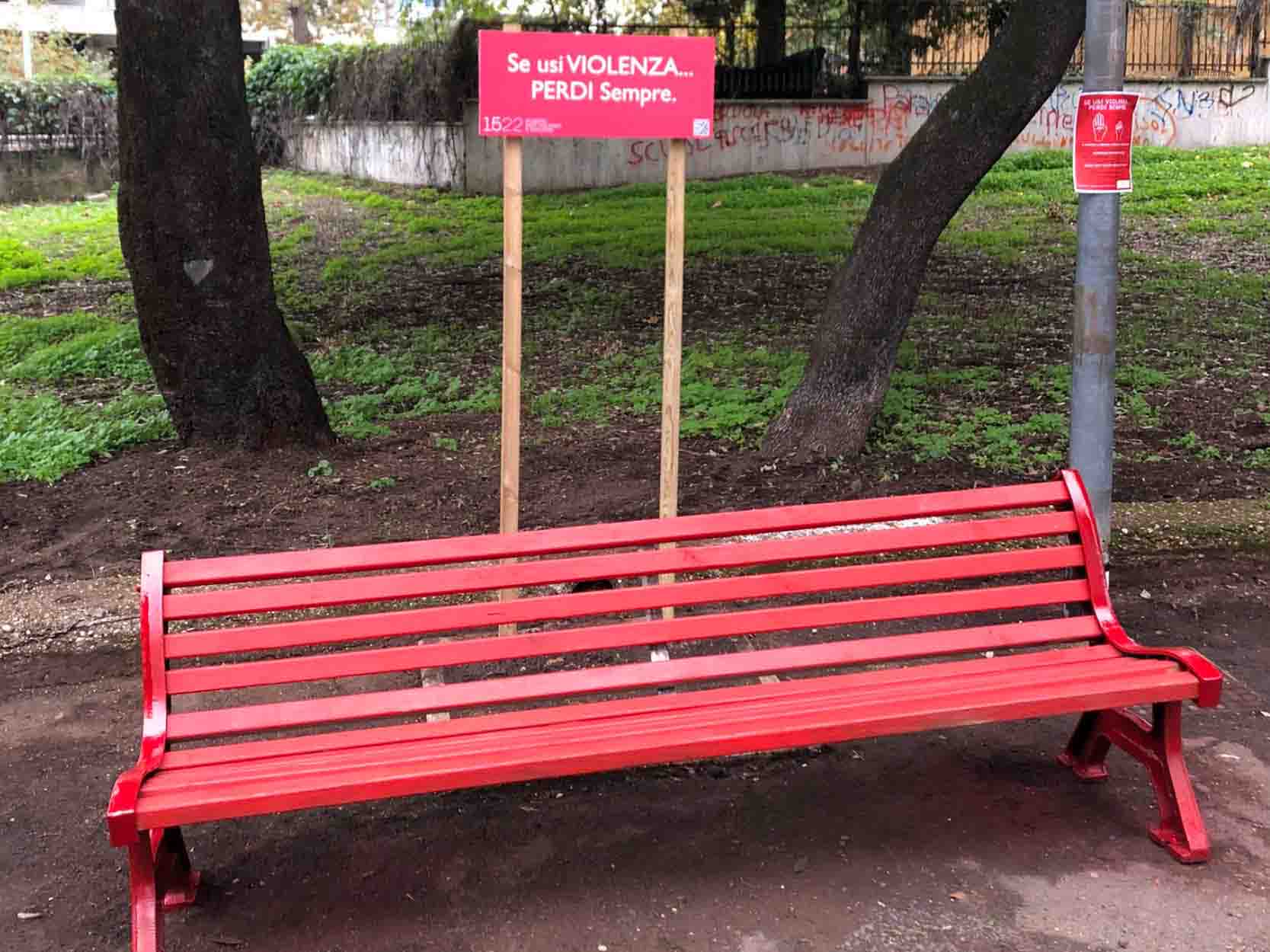 Inoltre, il 25 novembre dello scorso anno siamo riuscite ‒ grazie anche alla collaborazione armoniosa con l’Amministrazione pubblica ‒ a installare in Villa una panchina rossa contro la violenza sulle donne. E abbiamo creato un cartello originale contro la violenza che può essere letto da tutti i bambini all’uscita da scuola.