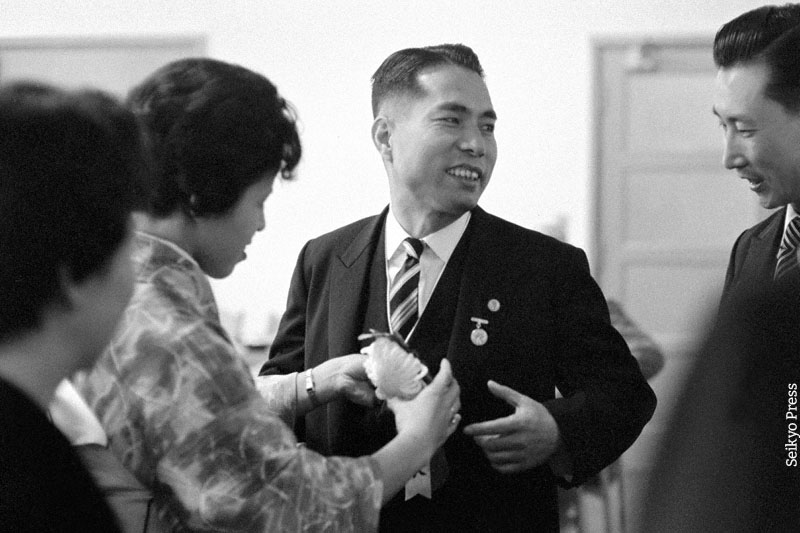 Kaneko Ikeda pone una coccarda sulla giacca di Ikeda Sensei prima della nomina a terzo presidente, 3 maggio 1960, Auditorium dell’Università Nihon, Tokyo