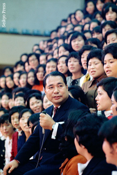 Il maestro Ikeda durante la cinquantaduesima riunione dei responsabili di centro, dicembre 2000, Auditorium Toda del Kansai