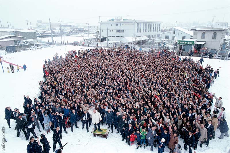Daisaku Ikeda insieme ai compagni di fede del Tohoku, gennaio 1982, città di Akita