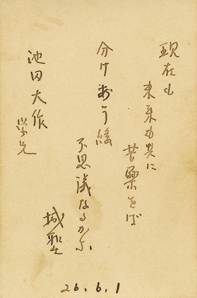 Sul retro della fotografia commemorativa della cerimonia del 3 maggio ricevuta da Ikeda Sensei, Toda aveva scritto la seguente poesia: