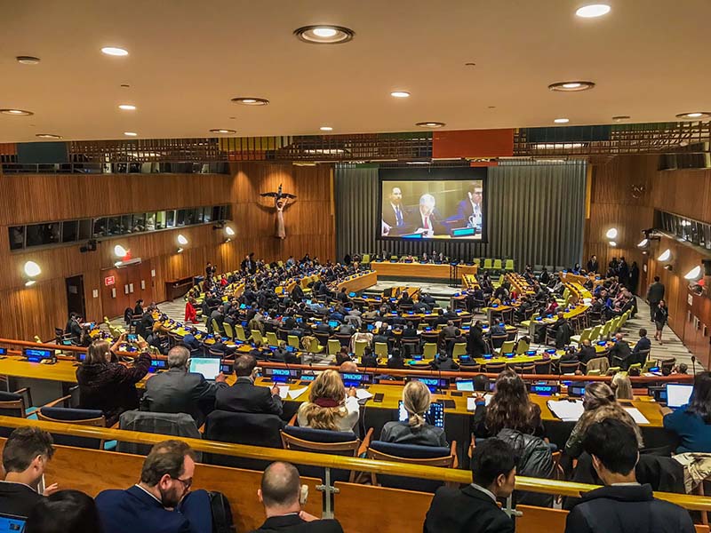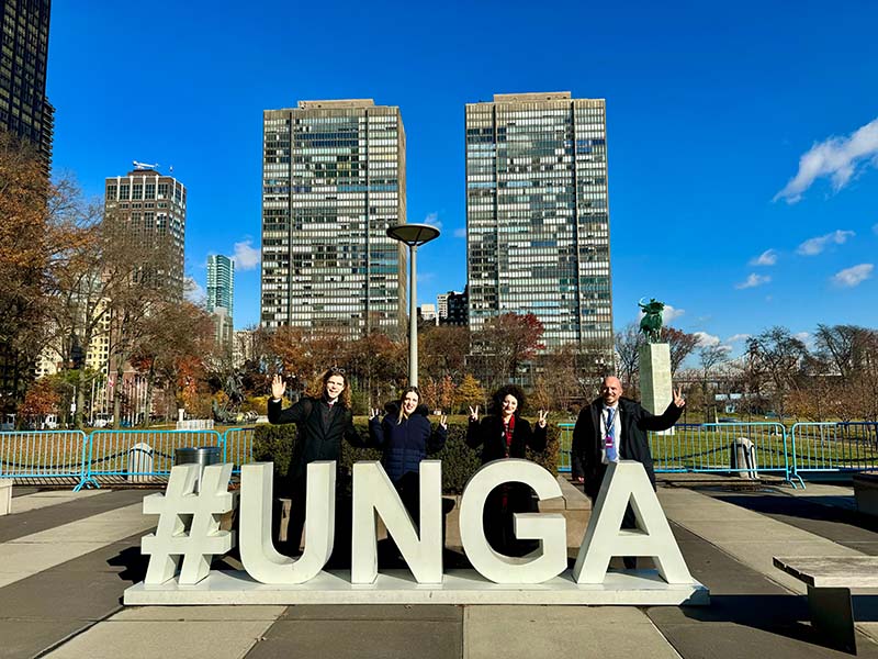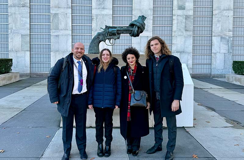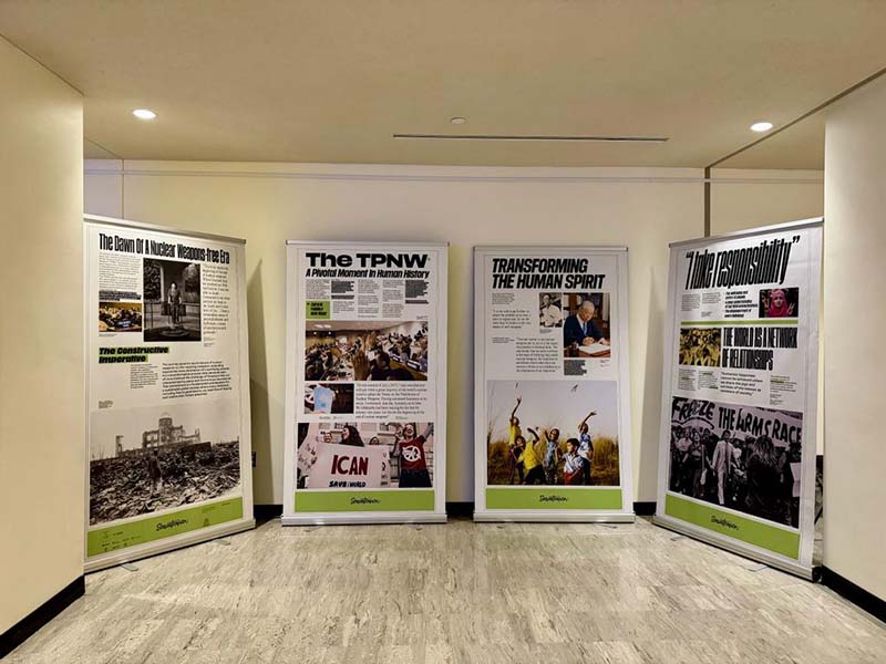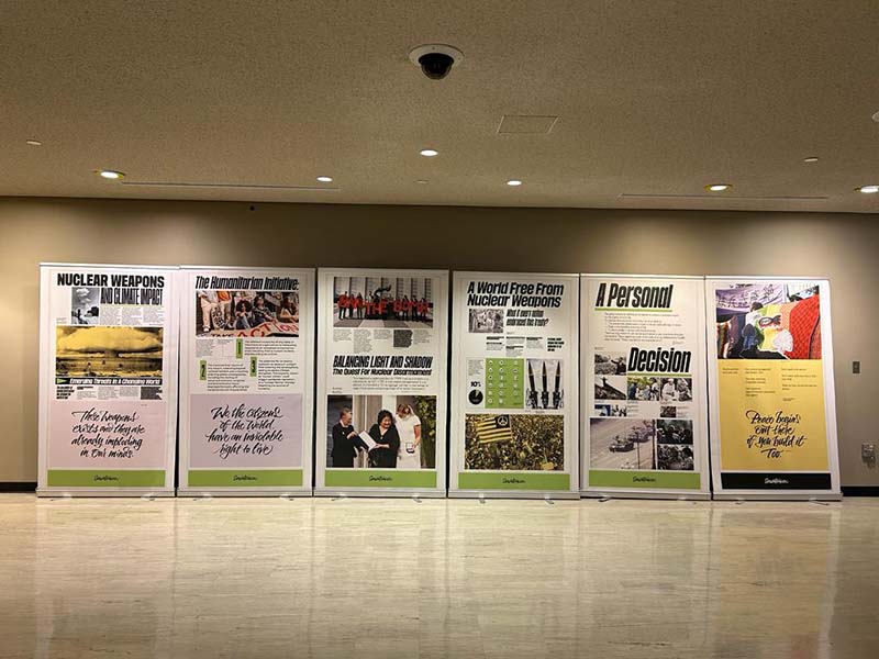 E a New York, presso il Palazzo di Vetro, sede delle Nazioni Unite, Senzatomica presenterà la versione compact della sua mostra, in inglese. Daniele Santi, presidente del Comitato Senzatomica, racconta: «Questo risultato quasi impensabile si è potuto realizzare grazie agli sforzi dei giovani della campagna Senzatomica. In un momento così significativo per tutti i membri della Soka Gakkai è commovente vedere i giovani che hanno ereditato la missione e il cuore del maestro Ikeda alzarsi con entusiasmo per diffondere la luce della speranza nella società. Questo risultato è stato possibile anche grazie a Malta, Stato Parte del TPNW, che ha deciso di co-sponsorizzare Senzatomica presentando la mostra alle Nazioni Unite».