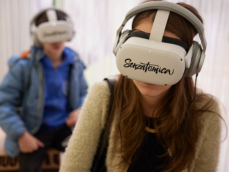 Indossando un visore si viene catapultati, grazie alla realtà virtuale, nel mezzo del brusio della vita quotidiana cittadina, tra i passanti di cui sembra quasi di sentirne il respiro. Il visitatore è avvolto dalle luci e dai colori della città che lo spingono a ruotare su se stesso per osservare tutto a 360°. A un certo punto però la frenesia di colori e suoni viene improvvisamente azzerata da un lampo bianco che annulla la percezione spaziale, prima molto vivida. In questo modo i visori sfruttano la tecnologia per provare a stimolare la comprensione di come sarebbe vivere un attacco nucleare. Il mondo si spegne e diventa tutto grigio. Ci si ritrova catapultati tra le rovine di Hiroshima e Nagasaki, appena bombardate. Ma non solo. Tutto quello che accade è raccontato dalla voce narrante della cantautrice Carmen Consoli. Un’esperienza profonda che stimola delle riflessioni sull’importanza di impedire che simili atrocità possano ripetersi.