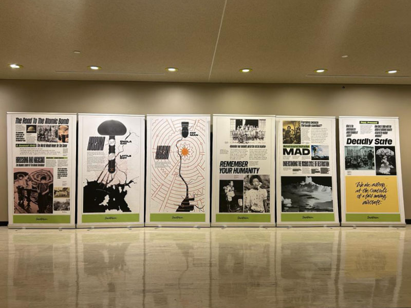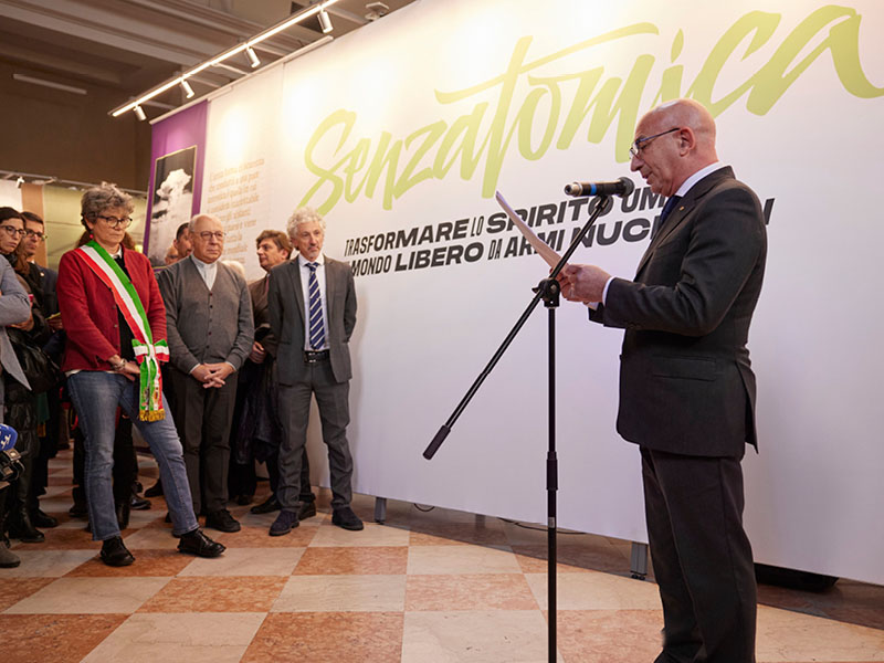 Il saluto finale è spettato a Daniele Santi, presidente del Comitato Senzatomica che ha concluso l’inaugurazione dicendo: «La strada che abbiamo scelto è ardua e lunga, ma non dobbiamo arrestare i nostri passi, dobbiamo andare avanti con tenacia e perseveranza. Ognuno di noi può lasciare il segno in ogni angolo del mondo. Questa non è solo una mostra, ma è “un’arma d’istruzione di massa”, capace di smuovere le coscienze e generare il cambiamento».