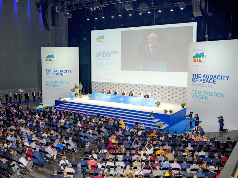 Il presidente della Repubblica Federale Tedesca Frank-Walter Steinmeier ha preso parte alla cerimonia di apertura e nel suo intervento ha citato vari momenti della storia in cui gli sforzi basati sulla fede hanno contribuito alla mediazione per la pace nelle aree di conflitto. In questo momento di crisi mondiale ha fatto appello a ulteriori sforzi per promuovere “l’immaginazione per la pace” e per incoraggiare il dialogo. Alla cerimonia di apertura sono intervenuti inoltre il fondatore della Comunità di Sant’Egidio Andrea Riccardi, il leader supremo dell’Islam sunnita Ahmad al-Tayyib, il segretario generale del Consiglio ecumenico delle chiese (CEC) Jerry Pillay e il presidente della Conferenza episcopale tedesca Georg Bätzing, che hanno portato il loro saluto.