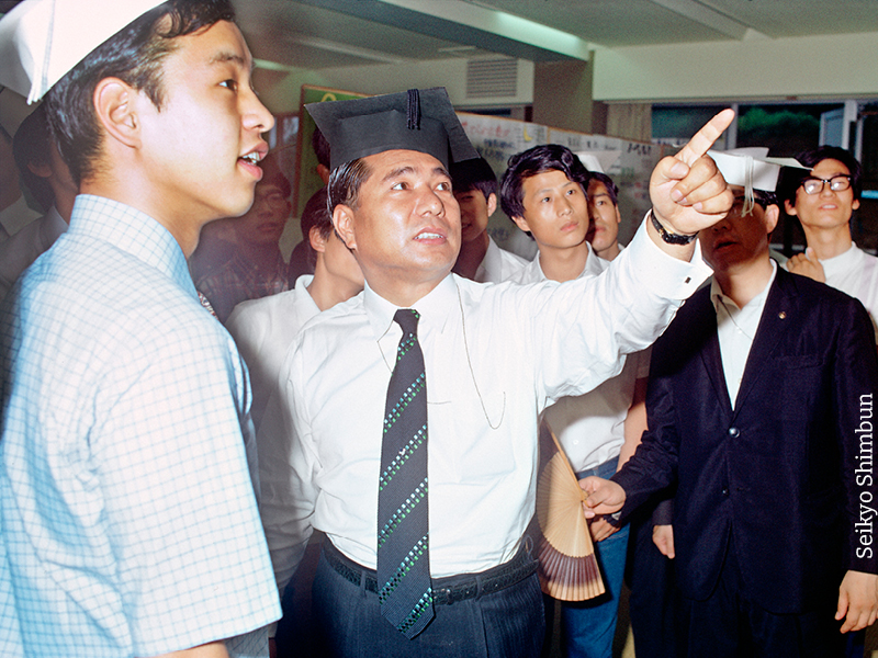Dopo l’apertura dell’Università Soka, Sensei visitò il campus per la prima volta in risposta a un accorato invito degli studenti a partecipare al loro primo festival universitario.