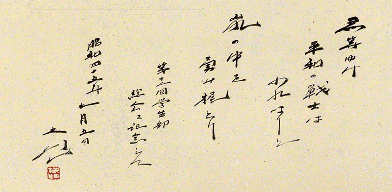 Per concludere, vorrei condividere con voi la calligrafia di una poesia che composi originariamente per la riunione generale del Gruppo studenti tenutasi nel luglio del 1970, in un periodo molto turbolento[5]: