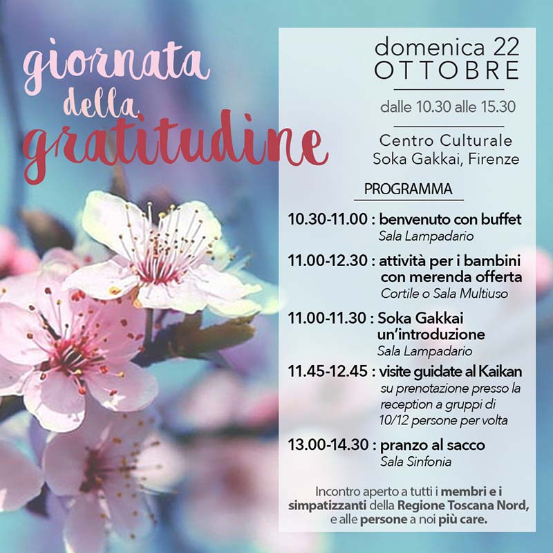 Domenica 22 ottobre presso il Centro culturale di Firenze si è tenuta la giornata della gratitudine che ha visto la partecipazione di circa 200 persone, tra cui 25 bambini. In particolare questi ultimi sono stati coinvolti in varie attività: giochi, disegno, teatrino… Inoltre sono stati allestiti dei buffet.