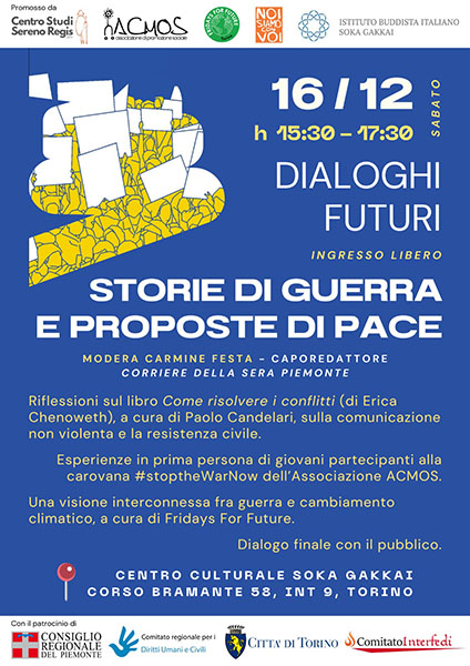 Il Centro culturale di Torino sabato 16 dicembre ha ospitato l’evento “Dialoghi futuri: storie di guerra e proposte di pace”, con circa cento partecipanti. Durante l’evento si è tenuta una tavola rotonda moderata da Carmine Festa, caporedattore del Corriere della Sera Piemonte. A partire dalle testimonianze di Ettore Bianchi (Operazione Colomba) si è ragionato sull’importanza delle iniziative umanitarie nei luoghi di conflitto. Grazie alla toccante testimonianza diretta di Emma Fontanarossa (Acmos), che ha partecipato alle carovane per la pace #stopthewarnow, i partecipanti hanno colto l’importanza del sostegno umano oltre agli aiuti umanitari materiali alle popolazioni colpite.